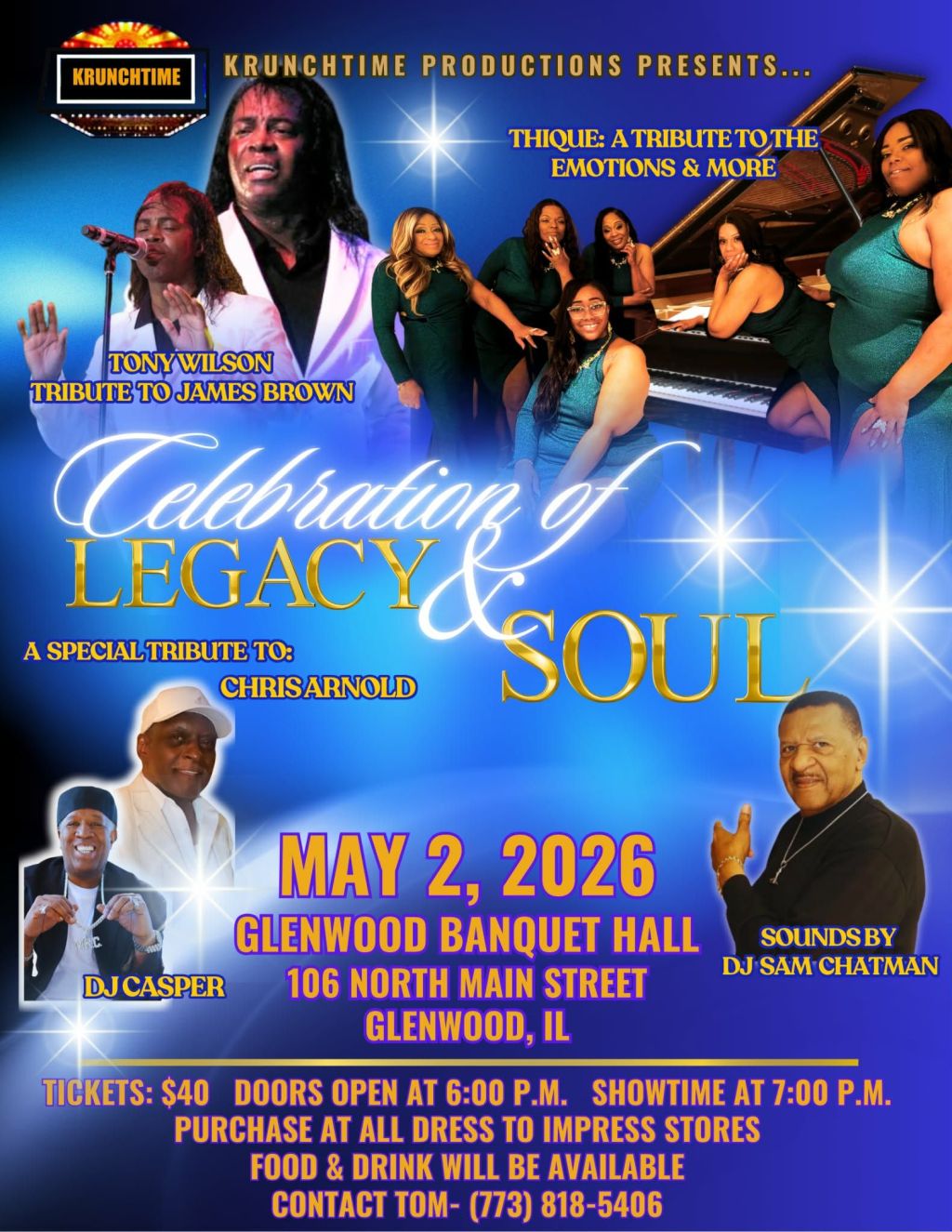 Celebration of Legacy & Soul is an unforgettable night honoring the timeless sound and spirit of classic soul music. Presented by Krunchtime Productions, this special evening brings together powerful tribute performances, live entertainment, and a celebration of musical legends who shaped generations.